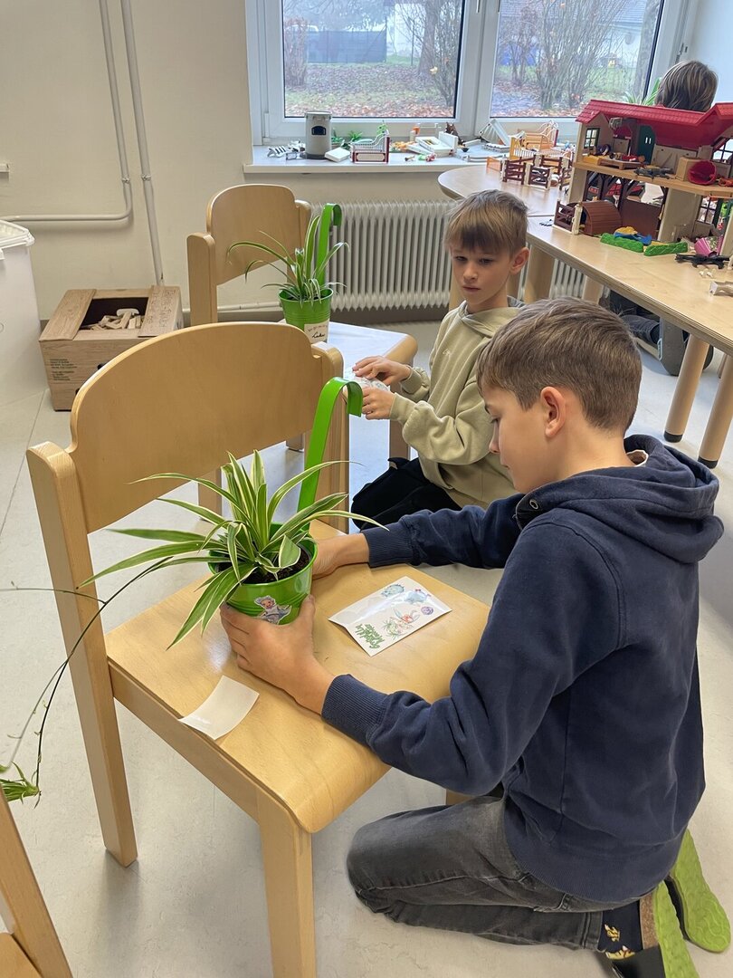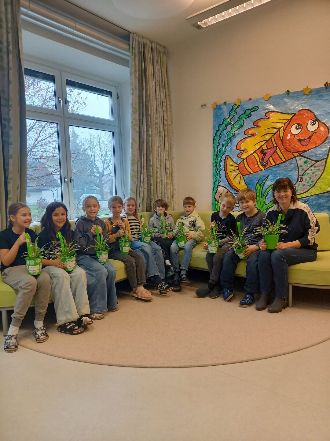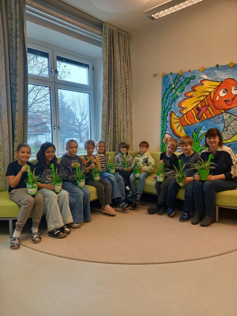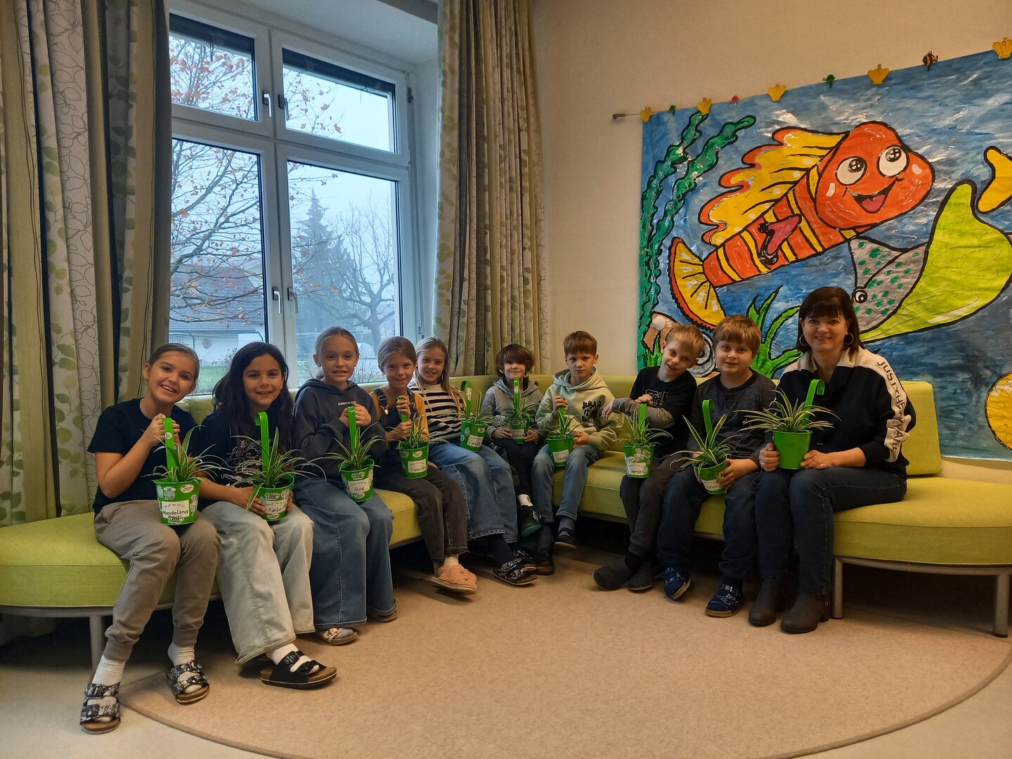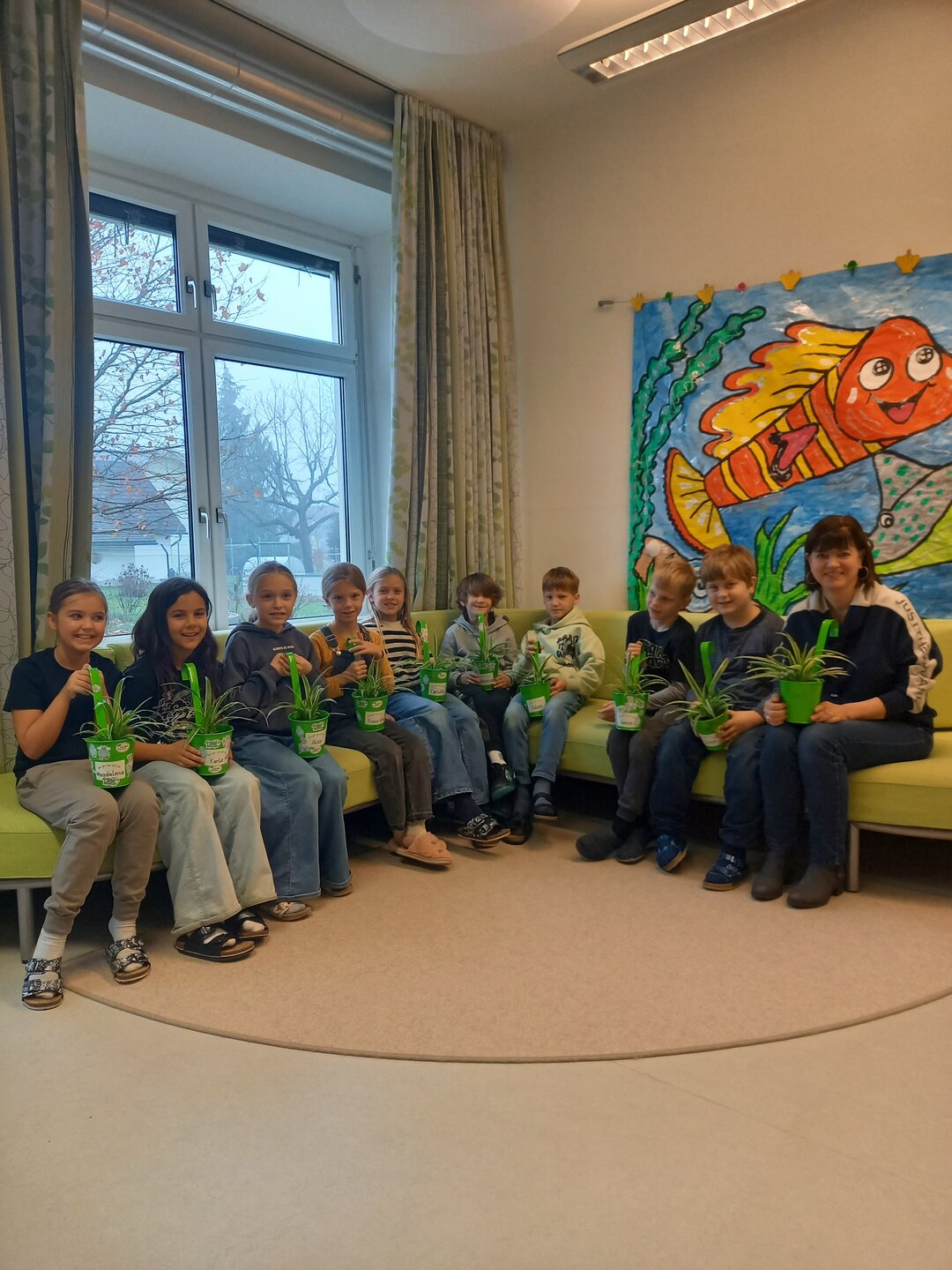 Im Rahmen des Projekts „Grüne Lunge“ besuchte uns eine Mitarbeiterin der Gärtnerei Messner und brachte den Kindern der 3. und 4. Klasse je eine eigene Pflanze mit.