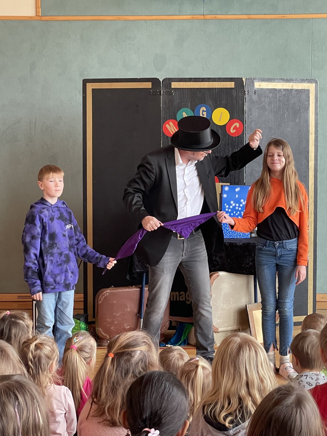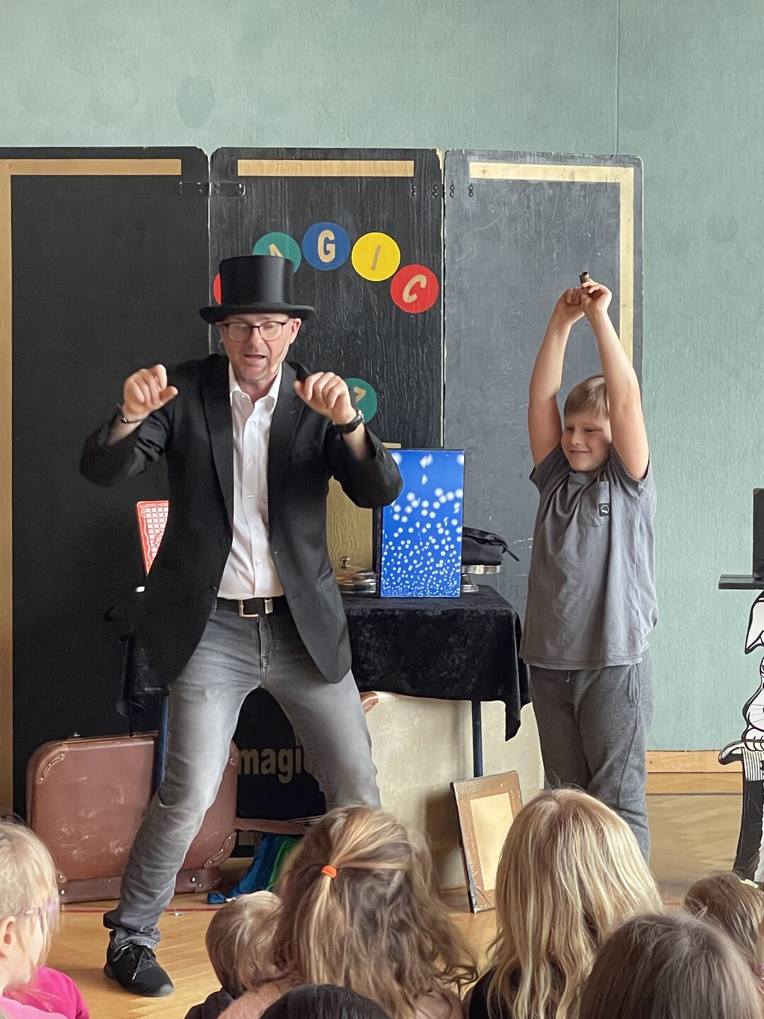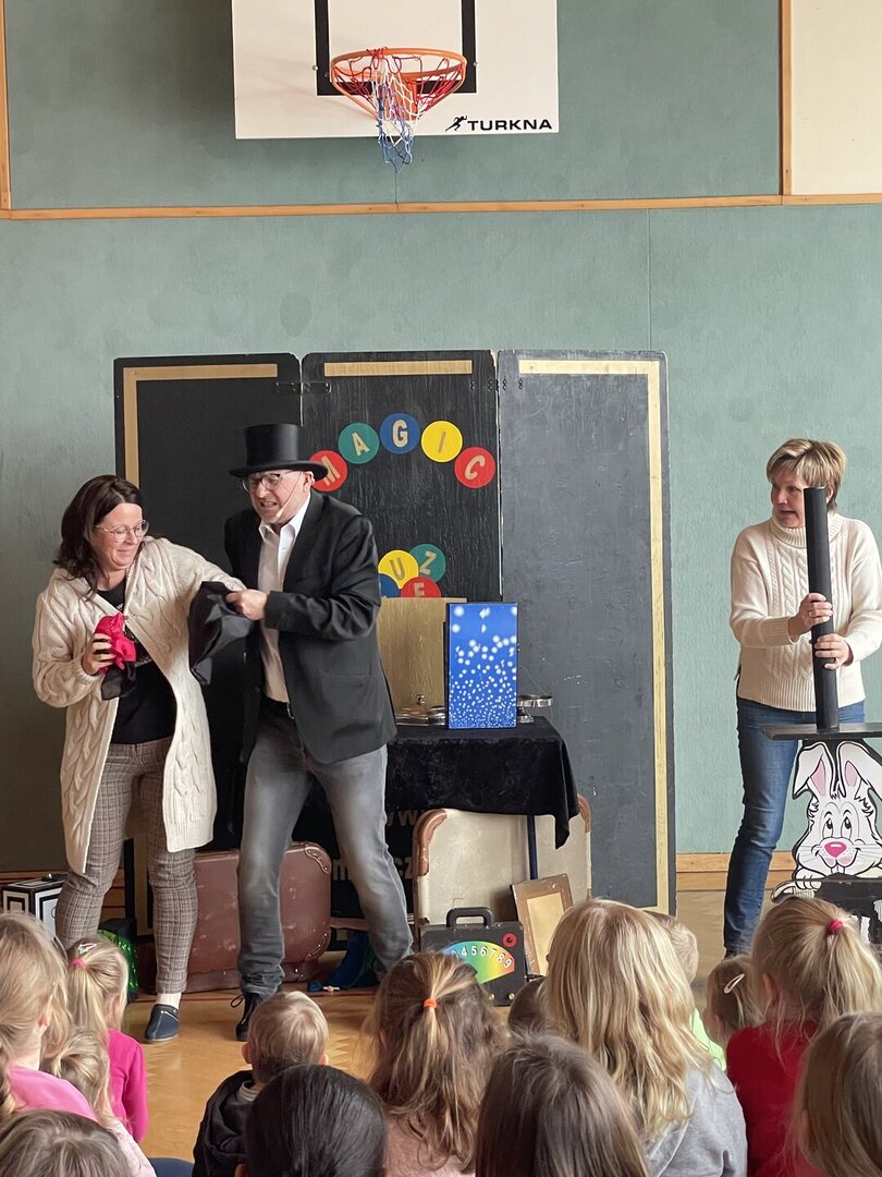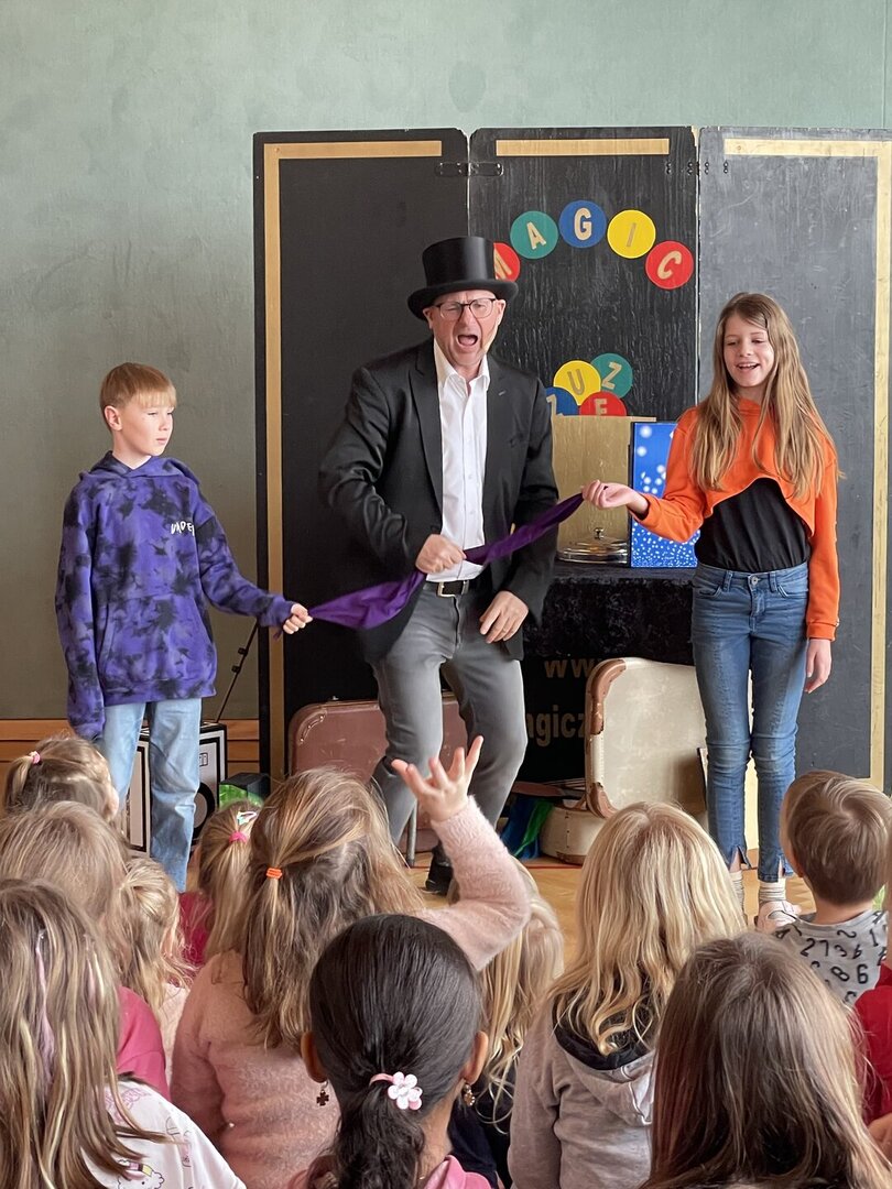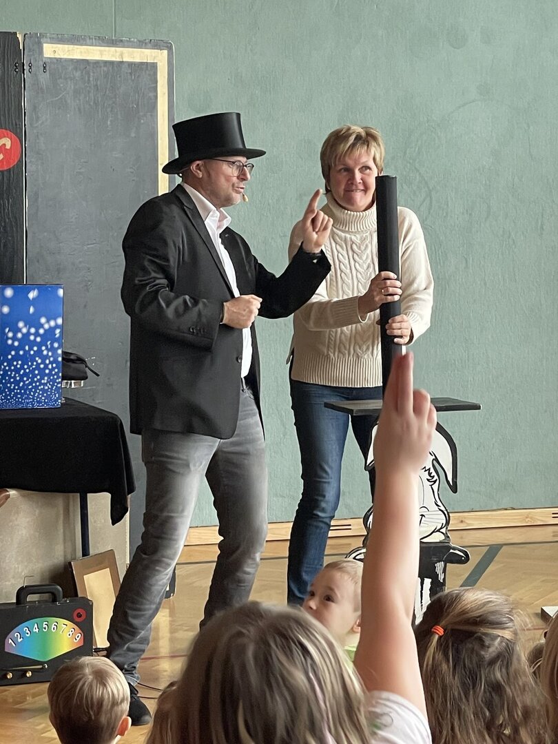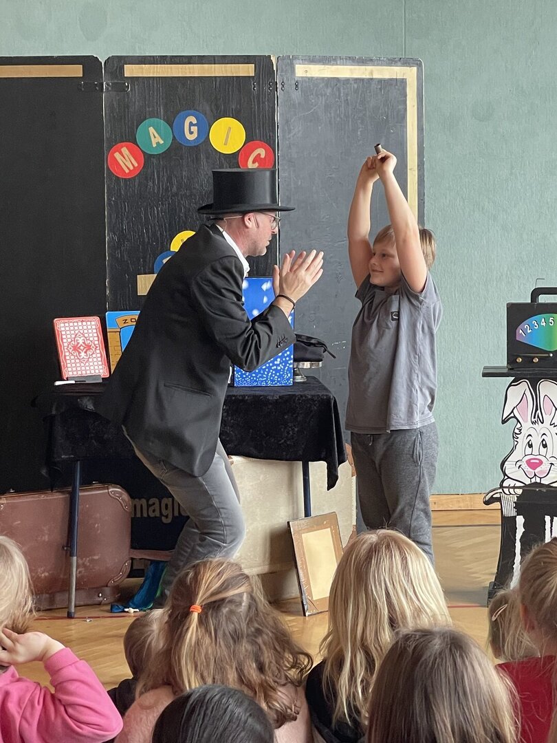 Mit verblüffenden Tricks, lustigen Einlagen und viel Charme zog er alle Kinder der Schule in seinen Bann. Es wurde gestaunt, gelacht, gezaubert – und sogar mitgemacht: Einige Kinder durften ihm direkt auf der Bühne assistieren.