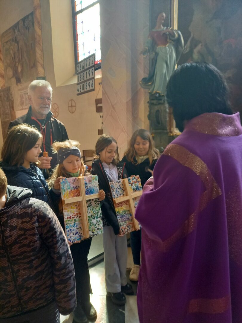 Poseben vrhunec obreda je bil blagoslov štirih križev, ki jih je za našo šolo oblikoval umetnik Hans Enzersfellner. Vsak križ je edinstveno umetniško delo – preprosto, a močno – in simbolizira vero, upanje, ljubezen in skupnost.