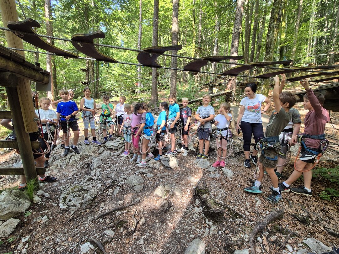 Alle Kinder, die im Schuljahr am zweisprachigen Unterricht teilgenommen haben, erlebten einen aufregenden Tag im Waldseilpark Tscheppaschlucht – mit viel Teamgeist und Abenteuer in luftiger Höhe.