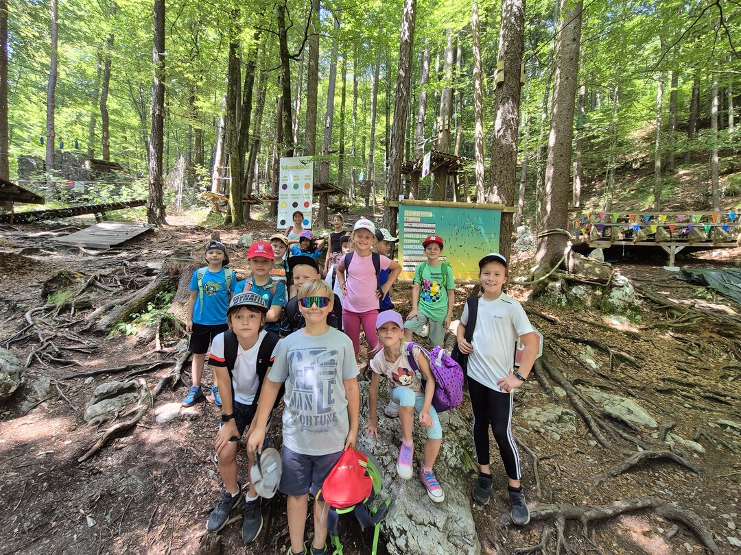 Kot posebna zahvala za sodelovanje pri dvojezičnem pouku so učenci, ki so se ga udeleževali, odšli na skupni izlet v gozdni pustolovski park Tscheppaschlucht. Tam jih je čakal dan, poln gibanja, izzivov in doživetij v naravi.
