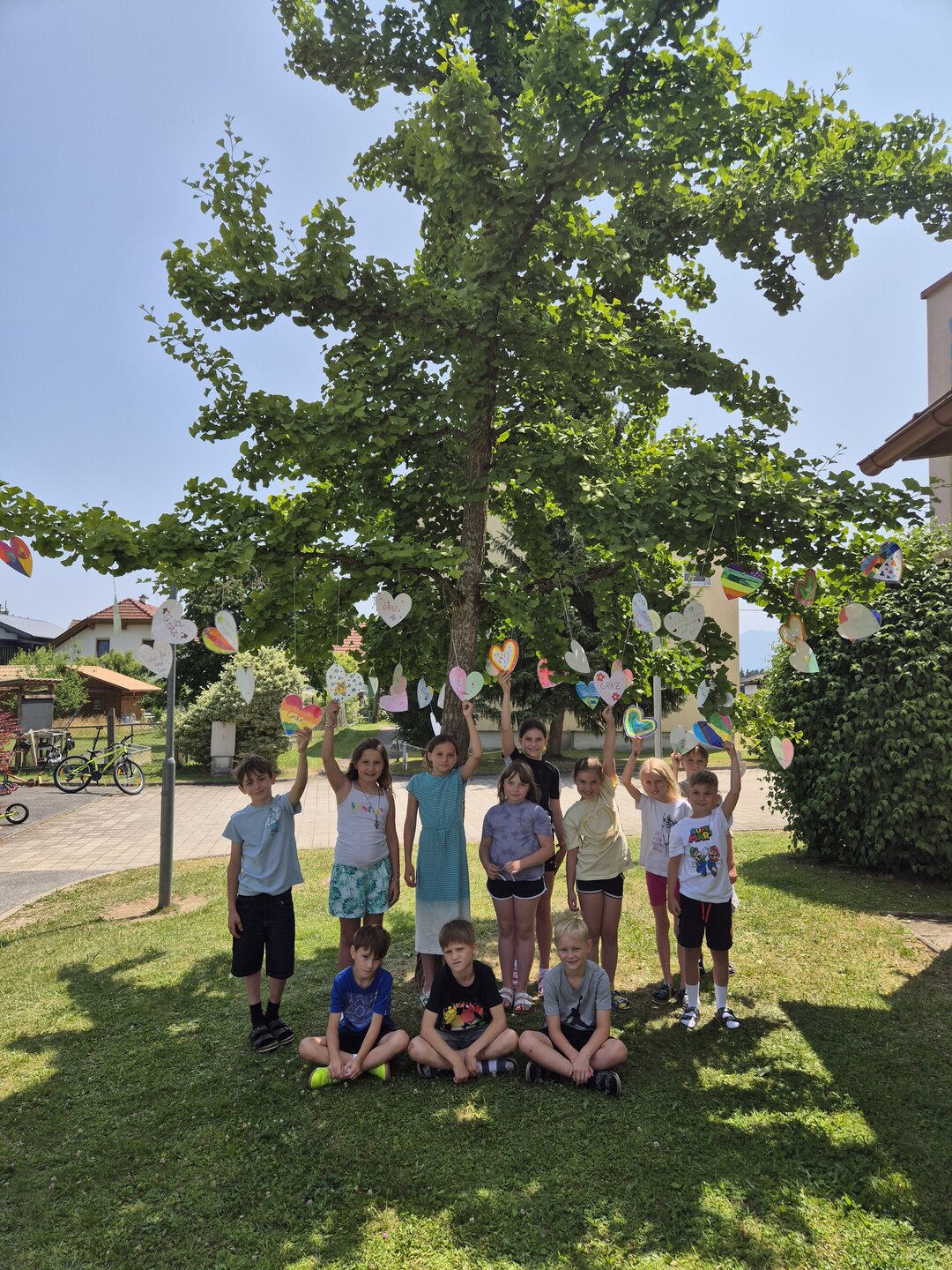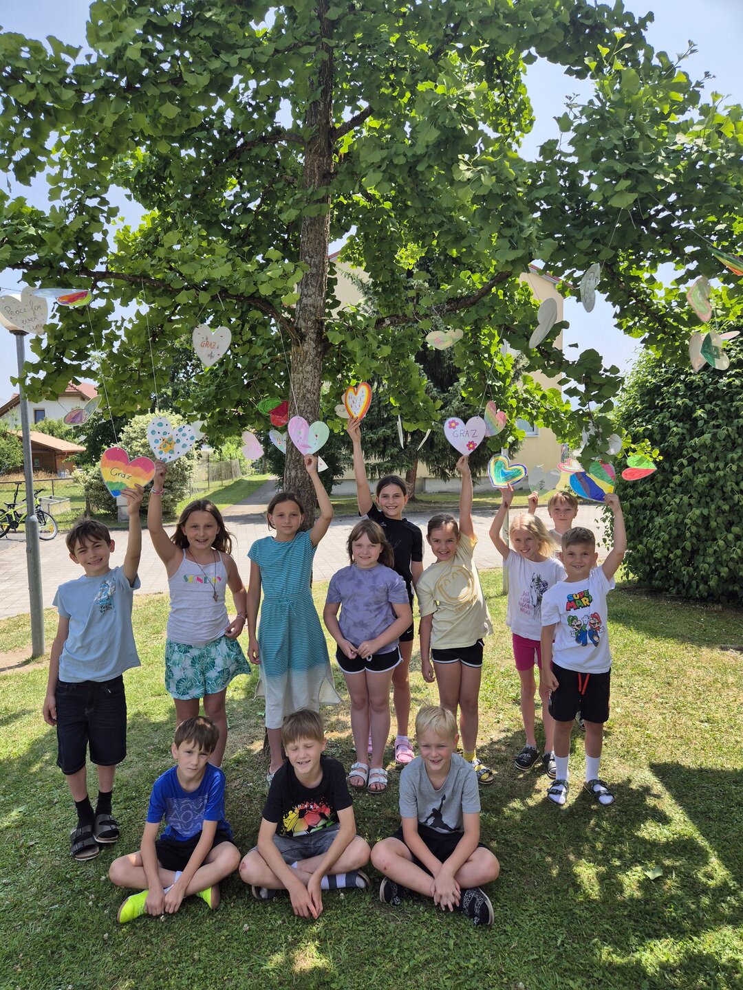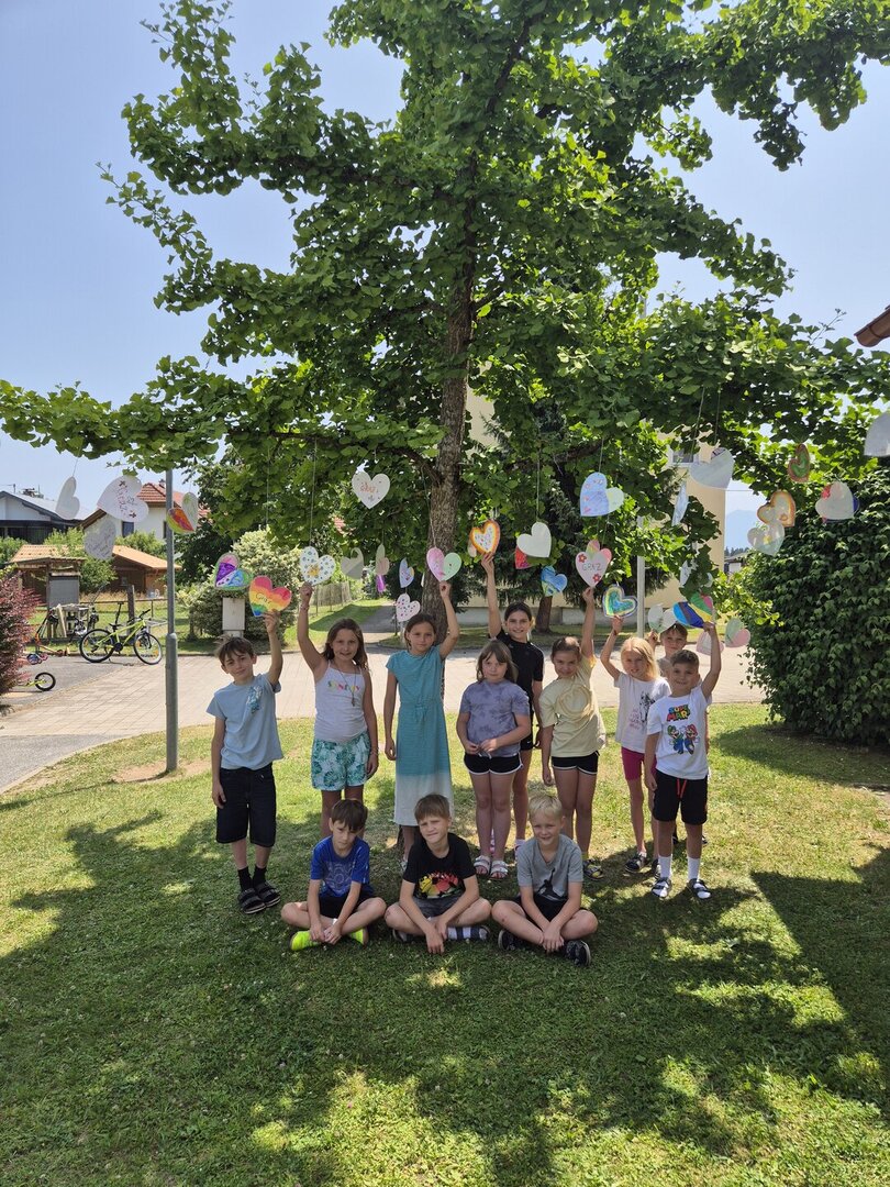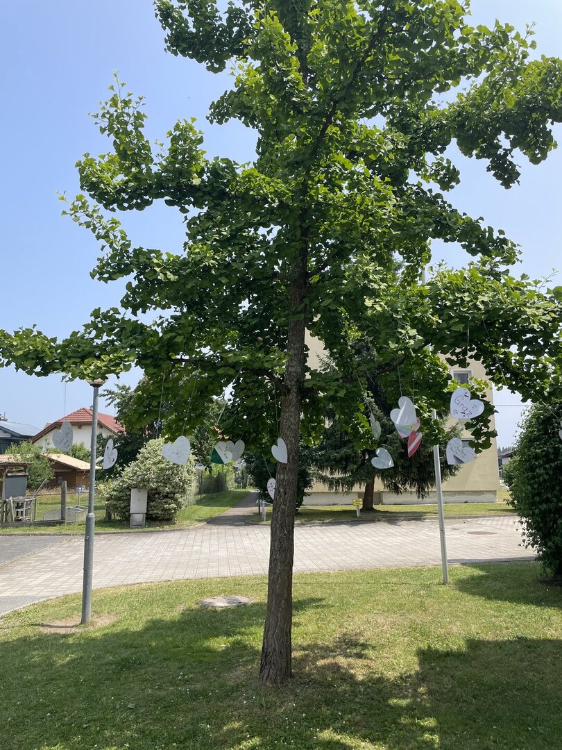 Als Reaktion auf den Amoklauf in Graz gestalteten alle Kinder unserer Schule Herzen mit persönlichen Botschaften – sie hängen nun als stilles Zeichen der Solidarität am Baum vor der Schule.