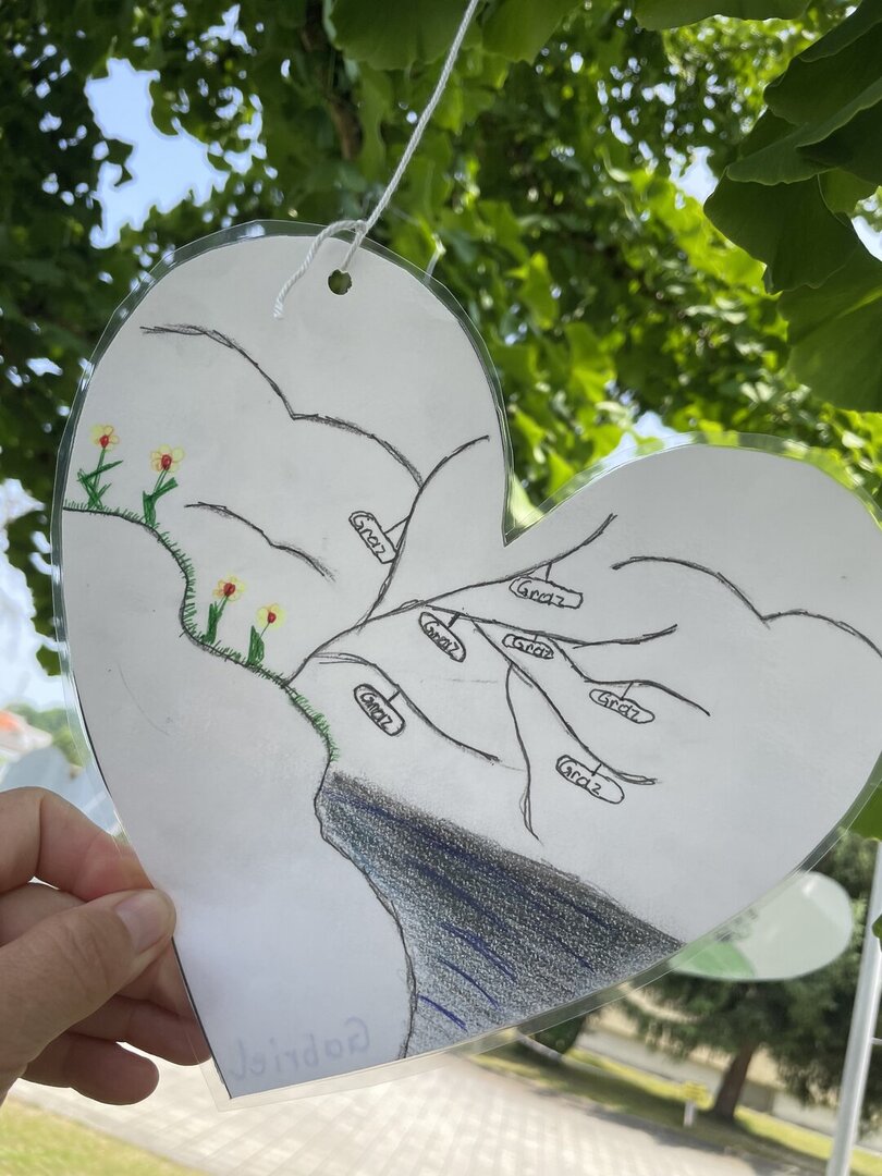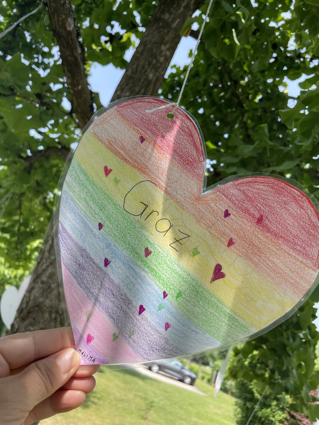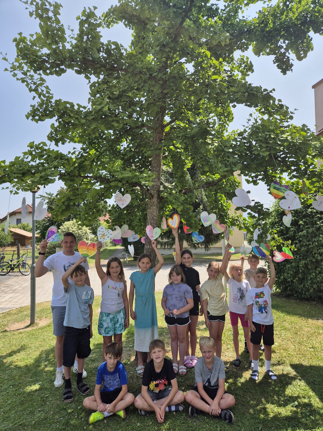 Als Reaktion auf den Amoklauf in Graz gestalteten alle Kinder unserer Schule Herzen mit persönlichen Botschaften – sie hängen nun als stilles Zeichen der Solidarität am Baum vor der Schule.